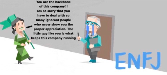 ENFJ: "당신은 회사의 주역이예요. 고마움도 모르는 무식한 사람들 대하느라 수고했어요. 당신같은 분 덕에 회사가 굴러갈 수 있어요"