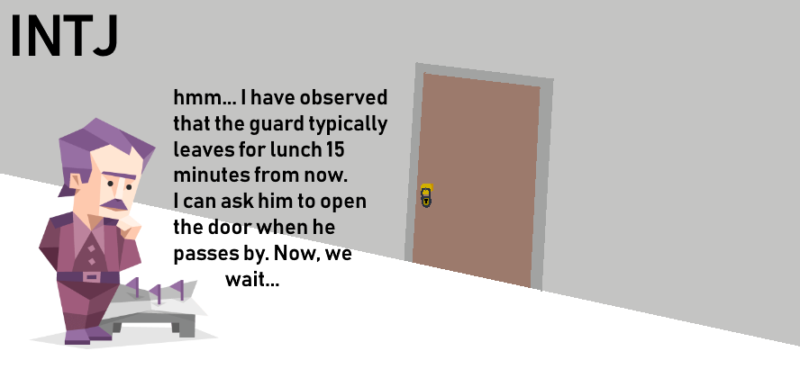INTJ: "음.. 내가 관찰한 바, 경비원은 보통 지금부터 15분 뒤에 점심먹으러 가. 그가 지나갈 때 부탁해야지. 지금은 기다리자.."
