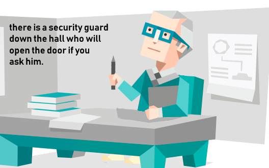 복도에 문을 열어줄 수 있는 경비원이 있다.