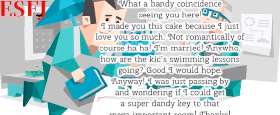 ESFJ: "여기서 만나다니 다행이예요! 당신이 넘 좋아서 이 케이크 만들었어요. 물론 이성적인 감정은 아니고요. 하하! 저 기혼입니다. 그건 그렇고 애들 수영 레슨은 어때요? 괜찮았음 좋겠는데. 어쨌건, 저는 그냥 들러봤어요. 중요한 방에 들어갈 수 있는 완전 멋진 키 받을 수 있는 지 궁금해서요. 고맙습니다!"