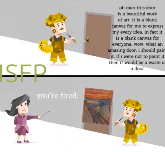 ISFP: "와, 이 문 예술인데. 내 아이디어를 표출할 수 있는 캔버스야. 실은 모든 사람을 위한 빈 캔버스. 우왕. 놀랍다. 여기에 그림 그려야지. 그림 안그리면 문을 낭비하는 것임"