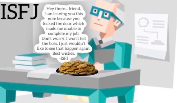 ISFJ: "안녕, 친구. 내가 이 글을 쓰는 이유는 너가 문을 잠가버려서 내 임무를 수행할 수가 없기 때문이야. 걱정마. 상사한텐 말 안할게. 다만 다시는 이러지 않았으면해."