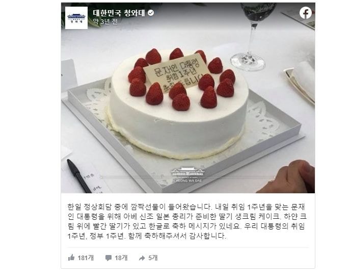 5월 9일 일본 도쿄 총리관저에서 열린 한·일 정상회담 오찬에서 문재인 대통령은 취임 1주년 기념 딸기 케이크를 선물 받았다.