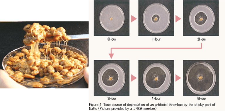 먼저 낫또엔 낫또에서 유래된 나토키나제라는 효소가 들어있다. 일본에 오랜 연구 끝에 혈전을 생기게 하는 원인인 피브린에 직접 작용하여 혈액응고를 막는 역활을 하는게 밝혀진다. 이 발견을 계기로 다양한 상품을 내놓게 된다.