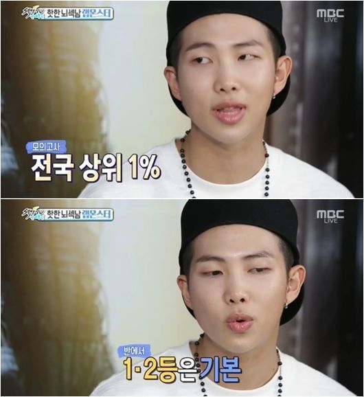 RM은 중학생 때 토익 850점에 고등학생 때 모의고사에서 언어,수리,외국어,사회탐구 모두 전국 1% 안에 들 정도로 수재였다. 고2때 학교에서 검사했던 그의 IQ는 148이었고 학창시절 그와 성적이 비슷했던 친한 친구는 서울대 경제학과에 진학했다.