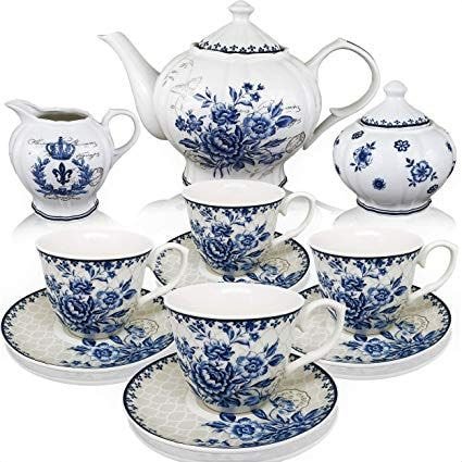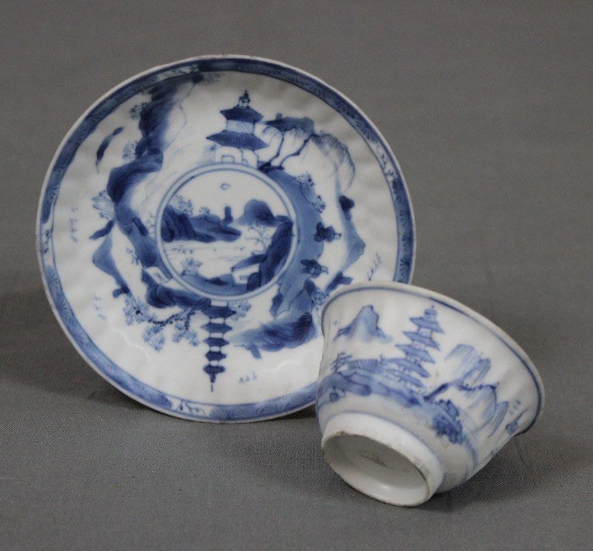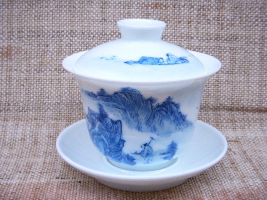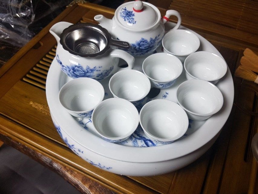 주전자와 찻잔을 보면 중국 그림이 그려져 있지.