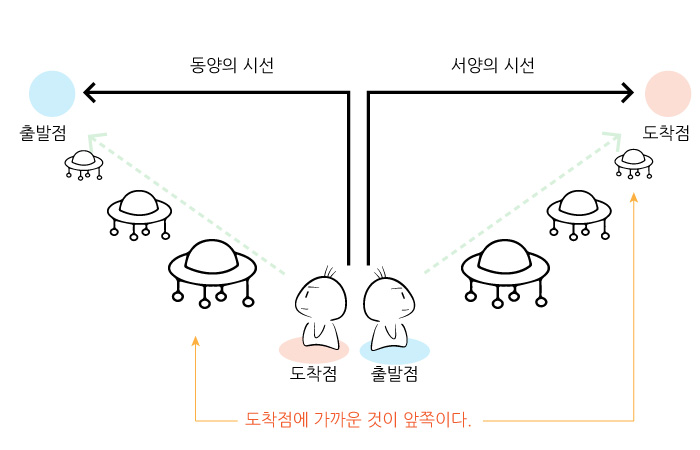 서양인들은 작은 우주선이 앞이라고 했고, 동양인들은 큰 우주선을 앞이라고 했다.