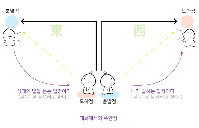 동양은 도착점에 있으므로, 상대의 말을 잘 들으라고 가르치고,