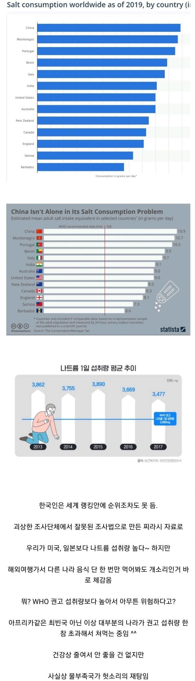 우선 한국인 나트륨 섭취량에 대한 문제 제기가 처음 이뤄진 시점(2000~2010)의 한국인 일평균 나트륨 섭취량은 5g에 근접(2010년 4831㎎)하여 확실히 많았고, 세계 최상위권이었다. 이때를 기준으로 한다면 한국인의 나트륨 섭취량은 확실히 문제가 있었다. 그러나 '현재의 한국인 나트륨 섭취량'은 3274㎎(2019년 국민건강영양조사)으로 10여년 사이에 빠르게 줄어들었으며, 현재의 한국인 일평균 나트륨 섭취량은 세계 평균과 비슷하거나 조금 낮은 수준이다.