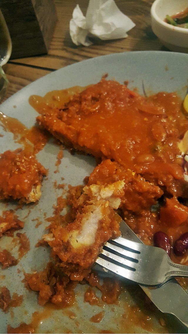 매운 돈까스는 땀 흐를 정도의 매운 맛.