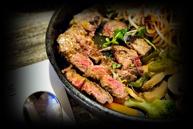 미디움 정도의 굽기. 고기, 야채, 콩샐러드, 스파게티, 숙주나물 등의 버라이어티한 조합.