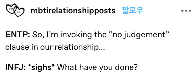 entp: 난 우리 관계에서 “탓하지 않기” 조항을 호출하고 싶어.