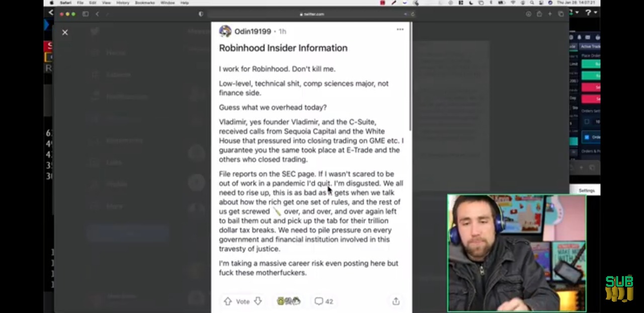 Vladmir 로빈훗의 CEO의 전화통화를 엳들었음. 내용은 즉 sequoia capital 과 White House 정부에서 gme 거래를 당장 중지하라고 압박이옴 . 그래서 난 역겨워서 내부고발을하고 짤리든 상관없다라는 메시지.