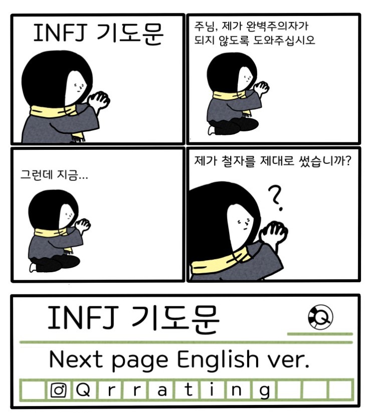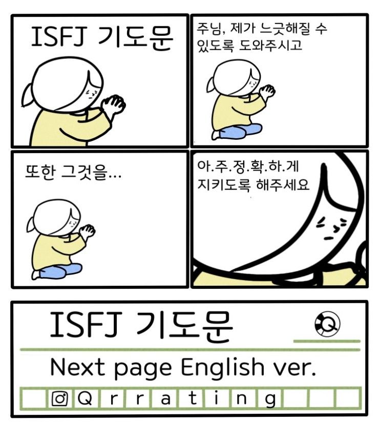 [만화] MBTI 유형별 기도문 4. ESTJ / ESFJ / ENFJ / ENTJESTJ 기도문 주님! 제가 일을 많이 벌려놓지 않도록 도와주세요. 하지만 제 도움이 필요하시면 말씀만 ...