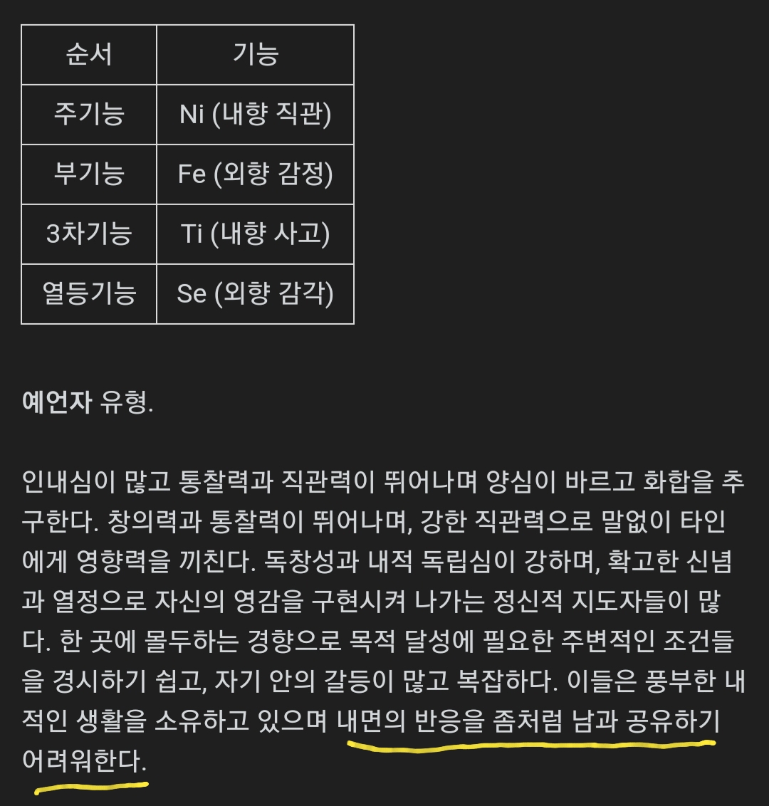주기능 Ni로 인해 생각이 많고, 부기능 Fe로 인해 타인에 관심이 많다.