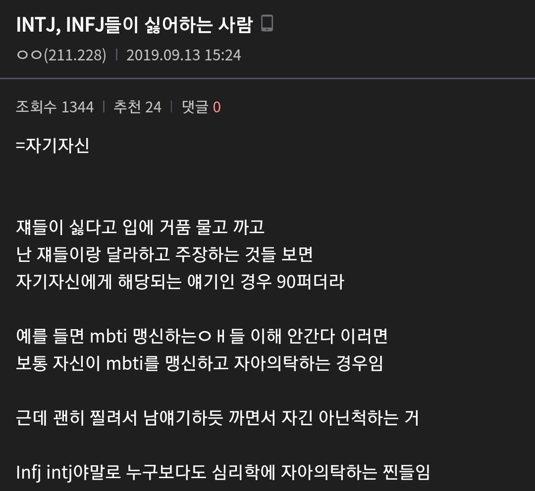 ENTP까는글 부터 쓰려했는데, 실수로 지워버렸다. 왜 지웠는지는 모르겠음. 찾아보니 안 보임. 그래서 묵혀놨던 다른글부터 마무리짓는다.