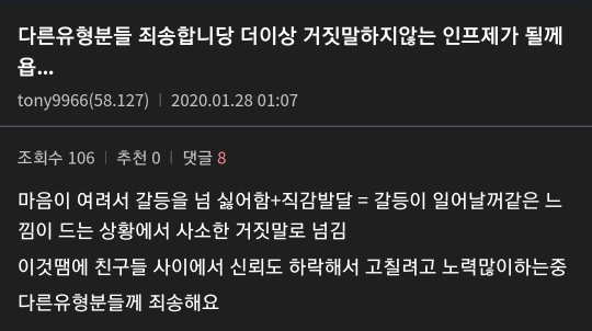 아쉽게도 내 가장 친한친구도 INFJ다. 그렇기에 비난할 생각은 없고 앞으로도 없을 것이다. 아무생각없던 단순한 글자나열이 당신을 불쾌하게했거든 사과한다. 하지만 T인 나에게는 이게 왜 기분나쁜지모른다는것도 알아줬으면 좋겠다. 그냥 무심코 던진 돌에 개구리가 맞은거다.