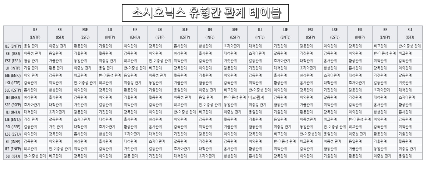 | MBTI 팩폭으로 궁합 보기(소시오닉스 관계론 필수 용어정리) (0) | 2021.02.05 |