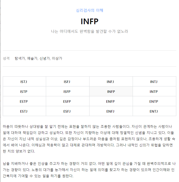 INFP에 대한 설명이다. 마음이 따뜻하지만 표현을 잘 하지 못하는 조용한 사람들. 출처 = 네이버 지식백과