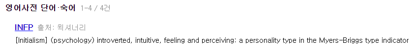 INFP의 영어 뜻. Introverted, intuitive, feeling and perceiving // 출처 : 네이버 어학사전