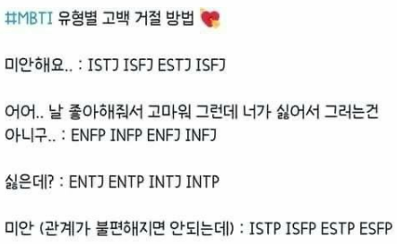 최악 : ISFP, ESFP, ISTP, ESTP, ISFJ, ESFJ, ISTJ, ESTJ