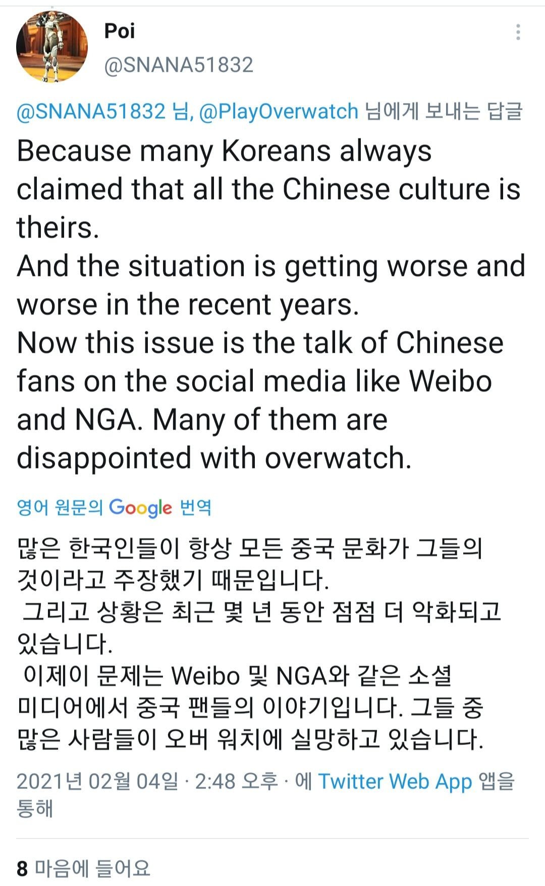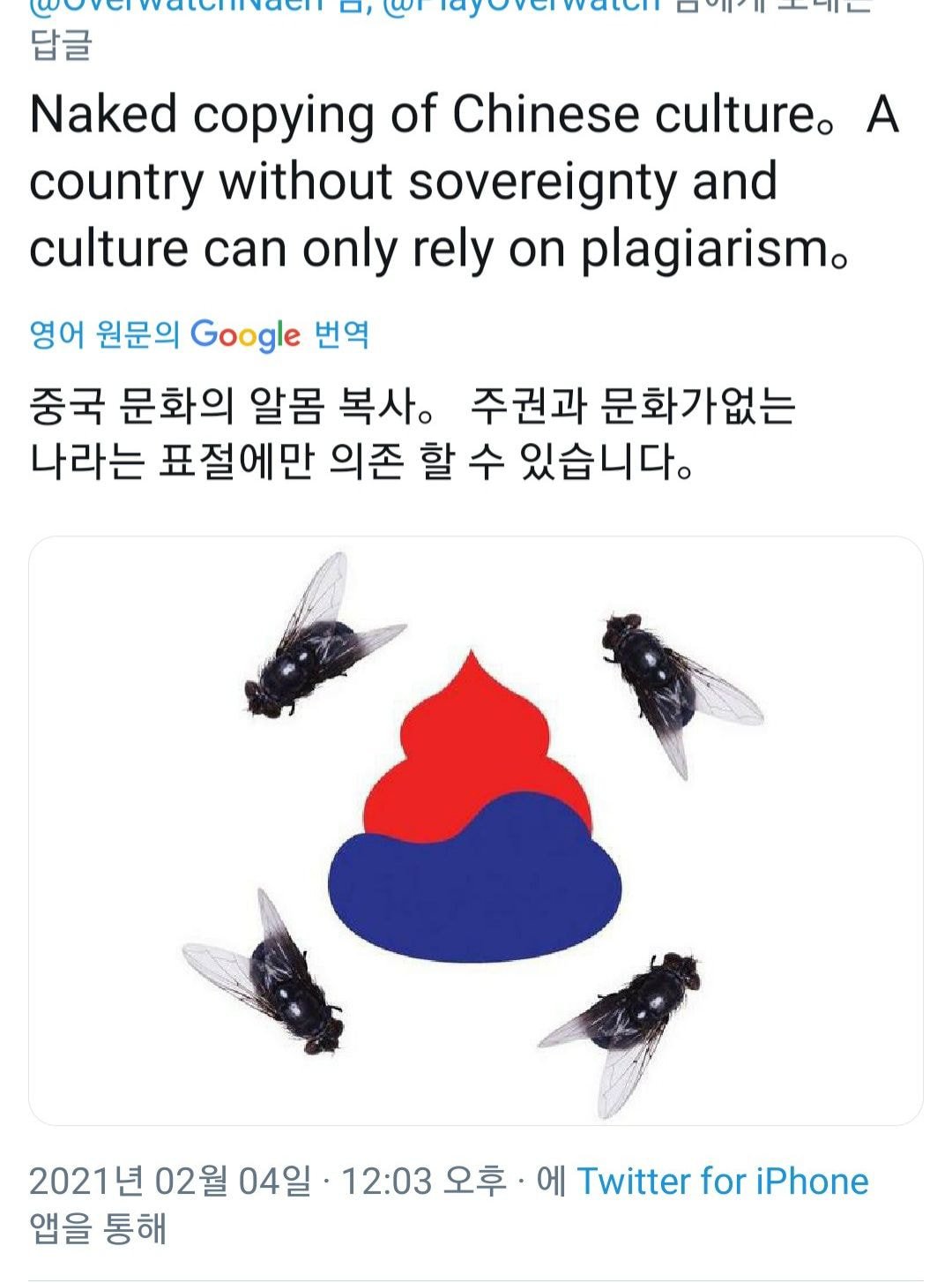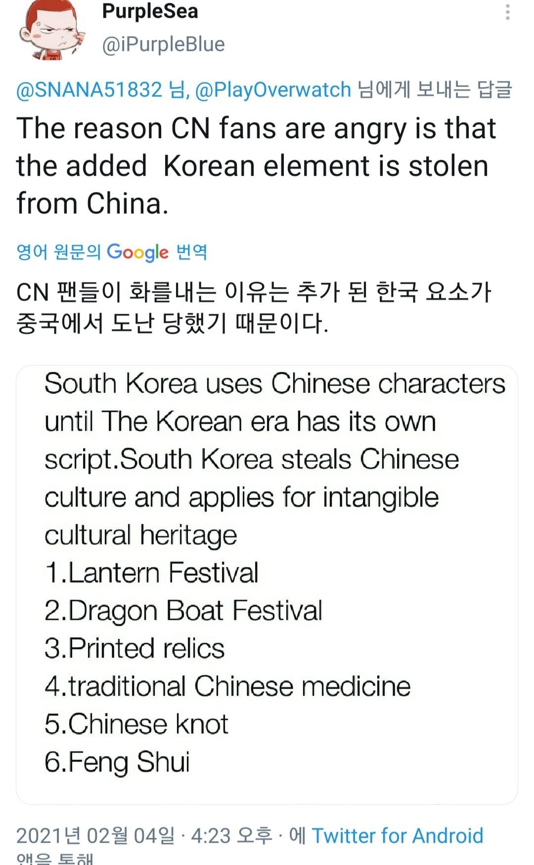 이에 빡친 중국인들(영어로 댓글달긴했는데 중국인들임): 왜 한국풍 스킨이 있지? 게다가 설날은 춘절 베낀건데? 오버워치 실망했다