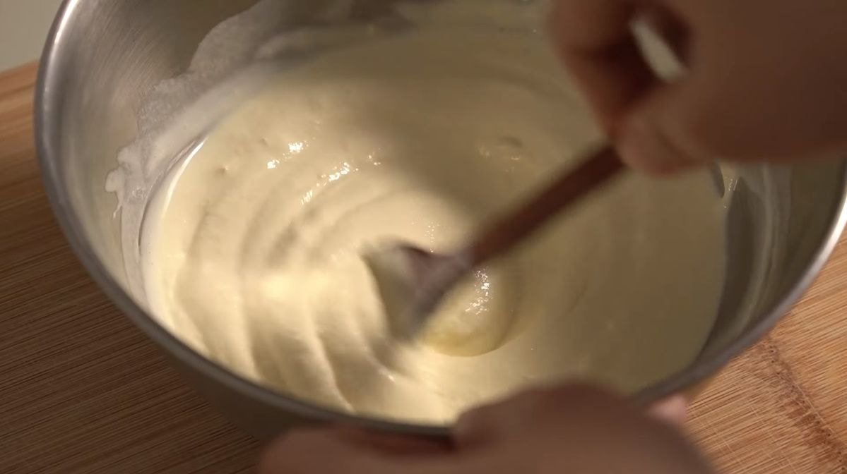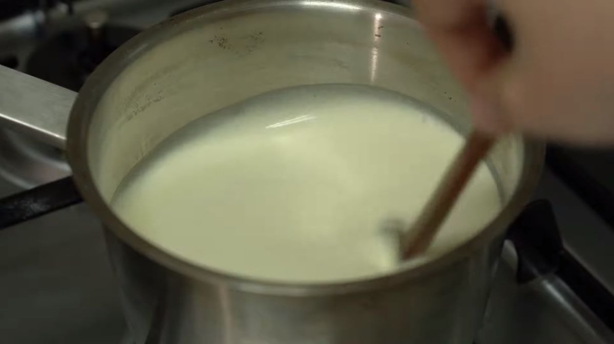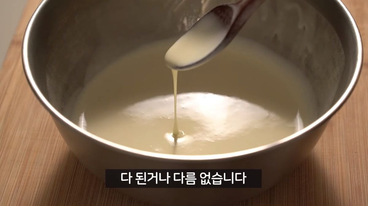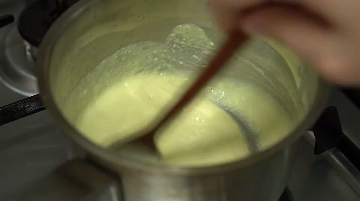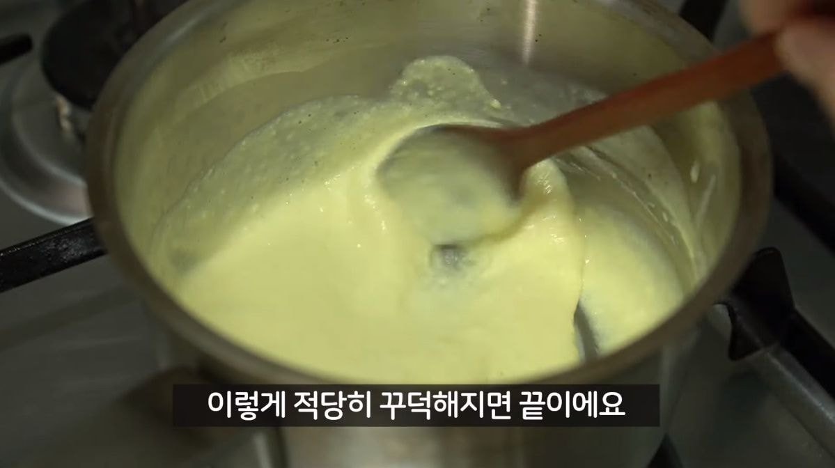 가스렌지 약불에 섞은 재료가 담긴 냄비를 올린 후 저어준다. 5분이 지나 색깔이 커스타드 크림처럼 변하면서 걸쭉하고 진뜩한 상태가 될 때까지 저어주면 된다.