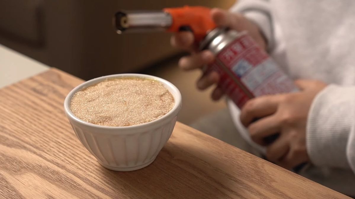 맨 위에 덮혀있는 설탕을 토치로 지져 녹여준다. 카라멜빛이 되어 녹으면 된다.