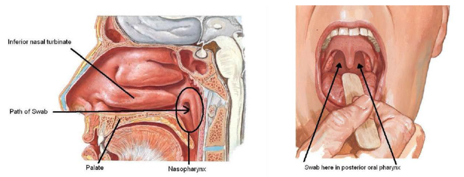 왼쪽사진의 동그라미 쳐져있는 부분 (nasopharynx)과 오른쪽 사진의 화살표가 가르키는 부분(oropharynx)이 각각 코와 입의 검체를 채취하는 곳이다.