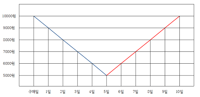 이번에는 위와같은 차트를 보자. 이번에는 1000원에 구매한 주식이 하루에 1000원식 떨어지다가, 6일차에 잠시 반등하더니 다시 하루에 1000원씩 떨어져서 10일차에는 1000원이 되었다. 이때 당신이 10일차 까지 주식을 들고 있었다면, 당신의 이익은 -8000원이다. 이번에는 이런 상황을 가정해 보자. 당신은 2일차 8000원이 되었을 때 손절매를 했다. 그리고 6일차에 반등하는것을 보고 다시 들어가서 기다리다가 10일차 까지 기다렸다. 이때 당신의 손익은 구매일~2일차 손절액인 -2000원에, 6일차~10일차의 손실액인 -4000원을 합쳐 -6000원이다. 또 다른 상황을 가정해 보자. 당신은 2일차 8000원이 되었을 때 손절매를 했다. 그리고 6일차에 반등하는 것을 보고 다시 들어가서 기다리다가 8일차 에 다시 손절매를 했다. 이때의 당신의 손익금은 구매일~2일차 손절액인 -2000원에, 6일차~8일차 손절액인 -2000원을 합쳐 -4000원이다.