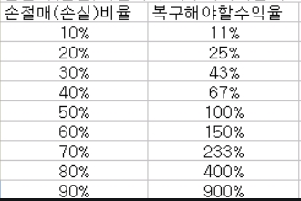 손절매를 잘해야 하는 또다른 이유가 있다. 그것은 바로 손해를 만회하기 위해서는 그것보다 더더욱 큰 노력이 들어가야 하기 때문이다. 위 차트는 원금을 손실했을때, 손실분을 만회하기 위해서는, 남은 돈으로 몇프로의 수익을 봐야 하는지를 써 놓은 표다. 예를 들어 당신의 시드머니가 100만원일때, 당신이 10%를 잃어서 당신의 남은돈이 90만원이라 해 보자. 남은 90만원으로 이익을 봐서 원금을 회복하려면 몇프로의 이익을 봐야 할까? 90만원의 11%(9.9만원)의 수익을 봐야 원금인 100만원으로 회복할 수 있다. 100만원의 50%를 잃으면 남은돈은 50만원이고, 50만원으로 100%의 수익률을 얻어야 다시 100만원으로 복구할 수 있다. 손실비율이 10프로 늘어날 때마다, 회복비율은 거의 배로 늘어나는 것을 볼 수 있다. 이것이 당신이 칼같이 손절애햐 하는 또다른 이유다. 안그래도 손해보기는 쉽고 이익보기는 어려운게 주식시장인데, 손해가 늘어날수록 원금을 넘어 최종적인 이익을 남기기가 더더욱 어려워진다. 이것이 당신이 손절매를 잘 해야 하는 또 다른 이유다.