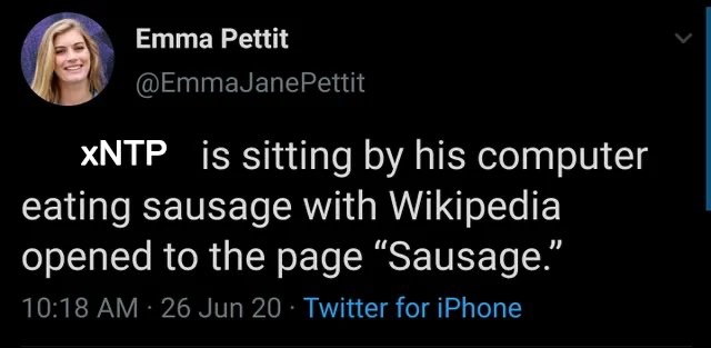 XNTP : 소시지를 먹으며 컴퓨터 앞에 앉아 위키피디아 소시지 페이지에 들어감