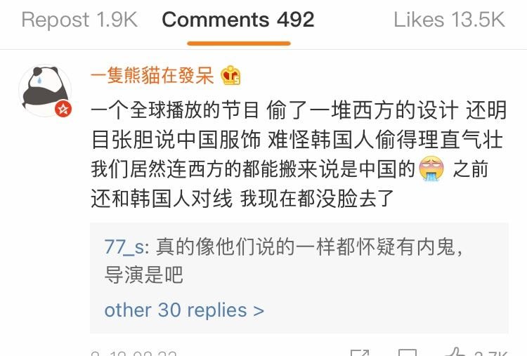 한 글로벌 방송 프로그램이 서양 디자인 한 무더기를 훔쳤는데 중국 옷이라고 공공연히 말하는 게 어쩐지 한국인이 훔치는 게 버젓한데 우리가 서양 것도 옮긴다니 중국 [토] 전에 한국인과 선을 긋고 있었는데 나 지금 얼굴도 안 보여