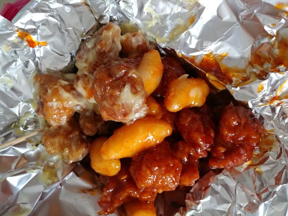 제일 유명한 곳은 큐스 닭강정이고 다양한 맛의 양념 닭강정이랑 닭똥집 튀김을 팜