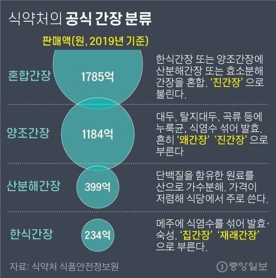 혼합간장=진간장 <- 산분해간장에 양조간장을 섞고 이것저것 첨가해서 만든거. 열이 가해져도 맛이 안변해서 볶음요리같은거 할때 쓰는거.