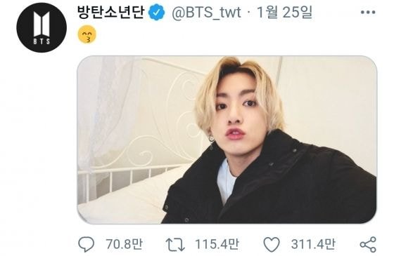 정국이 지난 1월 25일 트위터 방탄소년단 공식 계정에 게재한 금발 셀카 트윗이 최근 310만 '좋아요'를 넘어섰다.