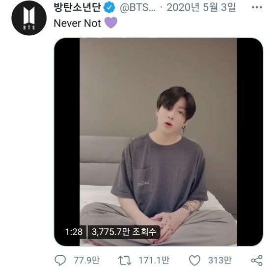 특히 정국이 지난해 5월 공식 계정에 게재한 'Never Not♥'(네버 낫) 트윗이 313만 '좋아요'를 얻은 가운데, 정국은 전세계 아트스트 최초로 310만 '좋아요' 트윗 2개를 달성했다.