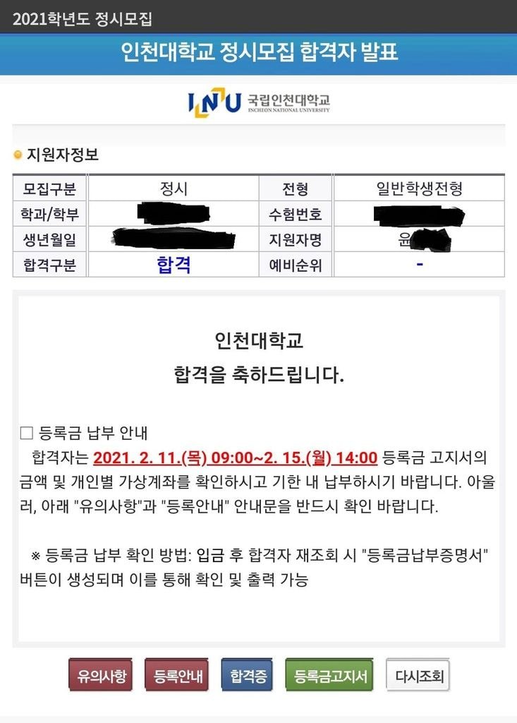 16일 인천대학교 등에 따르면 이 대학 정시전형에 1차 추가 합격한 수험생 A(24)씨의 어머니는 등록금 납부 시한인 전날 오전 9시 30분께 대학 측에 등록금을 보냈다.