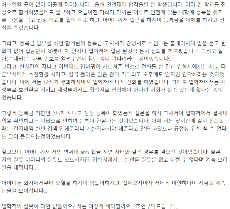 결국 등록금 납부 마감 시간인 오후 2시가 지났고, 대학 관계자로부터 등록금 미납으로 합격이 취소됐다는 안내를 받았다.