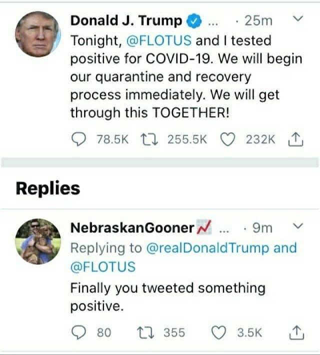 트 : 오늘 나랑 마누라(@flotus = 멜라니아 트럼프) 코로나 바이러스 검사 했는데 양성 나옴. 이제 격리들어감. 우린 이걸 함께 이겨나갈거야!