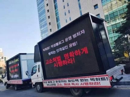 지난 1월 13일부터 서울 강남 빅히트 사옥, 여의도 등지에서 이어지고 있는 이번 지민 팬들의 트럭 시위는 지민에 대한 악의적인 글을 블로그 등에 게시하고 있는 악성 개인팬에 대해 빅히트가 소속사로서 의무를 다하고 있지 않다는 이유에서다.