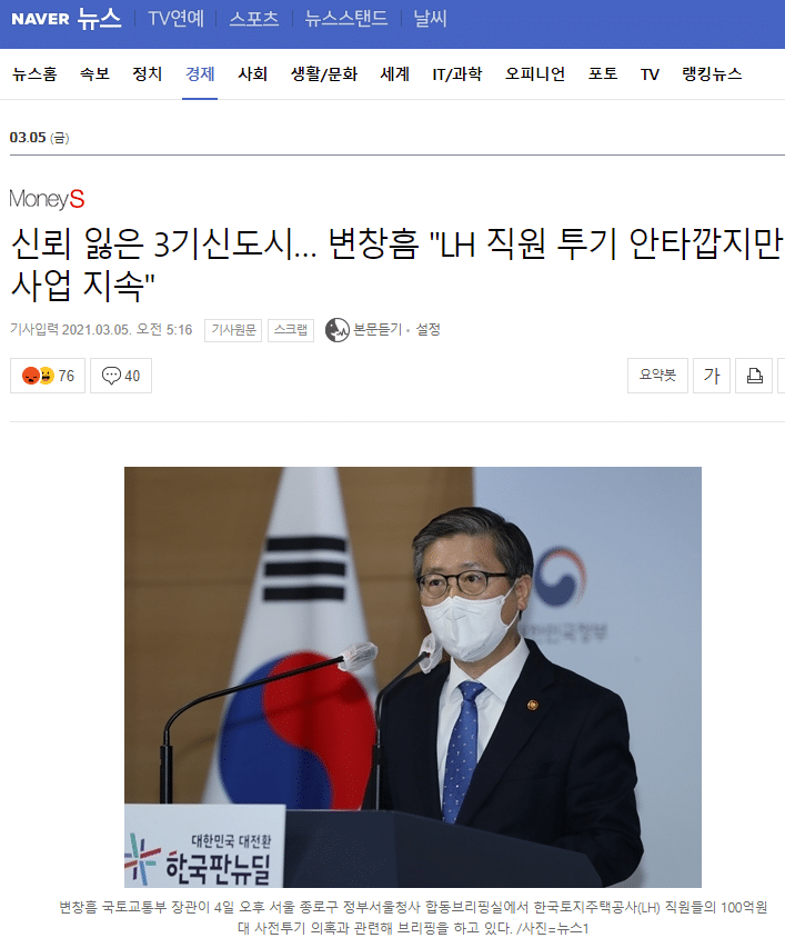변창흠 국토교통부 장관은 4일 오후 정부서울청사에서 온라인으로 대국민 긴급 브리핑을 열고 한국토지주택공사(LH) 일부 직원들의 광명·시흥 신도시 땅 사전 투기 의혹에 대해 "직원들의 토지매입 의혹이 일부 사실로 확인됐다"며 사과했다.