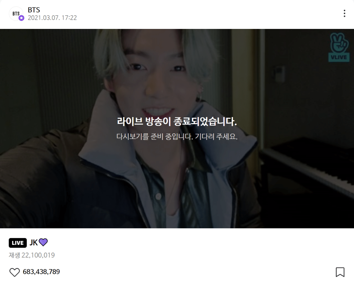 | 실시간 시청자수 2200만으로 브이앱을 종료한 한 아이돌의 역대급 엔딩 (주어 방탄 정국) (0) | 2021.03.08 |