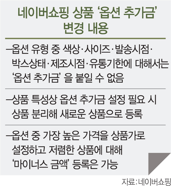 10일 업계에 따르면 네이버 쇼핑은 다음 달 5일부터 일부 옵션 유형에 따라 판매자들이 추가금을 설정하지 못하도록 상품 등록 기준을 변경할 예정이다. 옵션 유형 중 색상·사이즈·발송 시점·박스 상태·제조 시점·유통기한에 대해서는 추가금을 설정할 수 없다.
