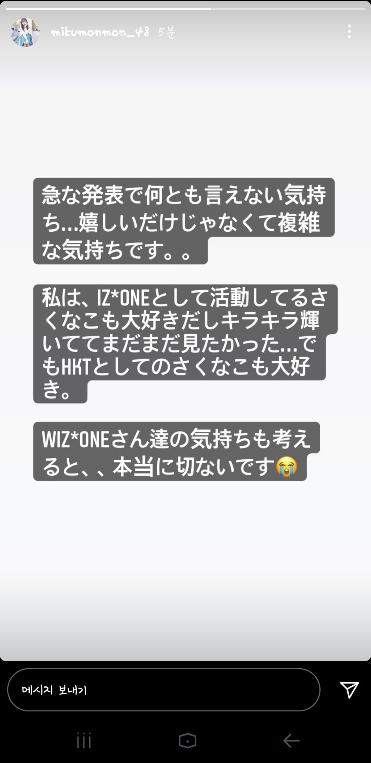 오늘 아이즈원 해체 공식 기사가 뜨자 사쿠나코오오오오라는 트윗과 인스토리를 올림(둘의 HKT48 복귀를 기대하면서 올린듯)