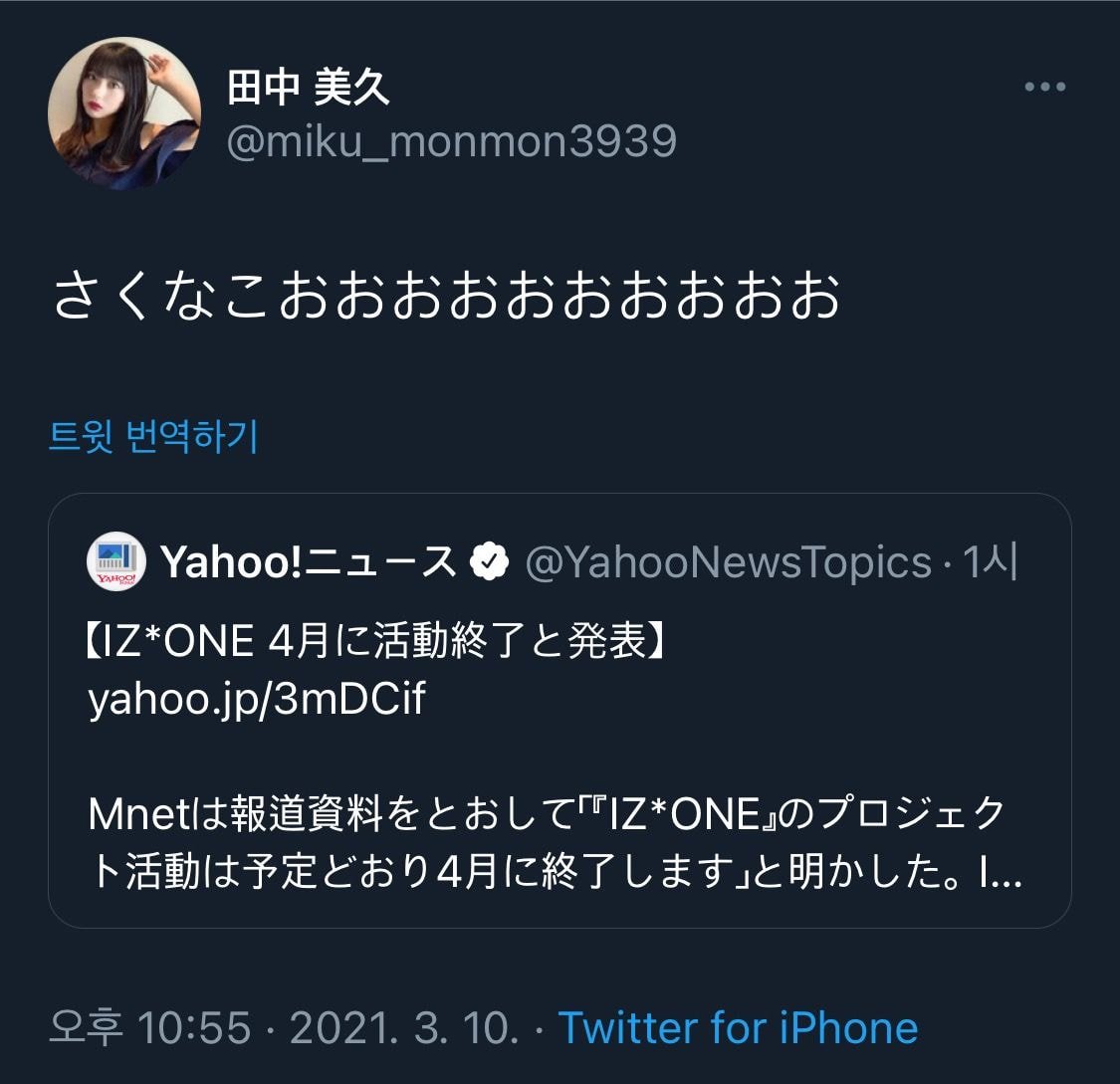 오늘 아이즈원 해체 공식 기사가 뜨자 사쿠나코오오오오라는 트윗과 인스토리를 올림(둘의 HKT48 복귀를 기대하면서 올린듯)