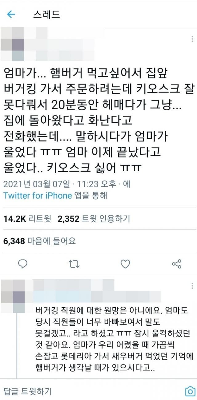 지난 7일 네티즌 A씨는 트위터에 “엄마가 햄버거 먹고 싶어서 집 앞 버거킹에 가서 주문하려는데 키오스크를 잘 못 다뤄서 20분 동안 헤매다 그냥 집에 돌아왔다고, 화난다고 전화했다. 말하시다가 엄마가 울었다. 엄마 이제 끝났다고 울었다”고 글을 적었다.