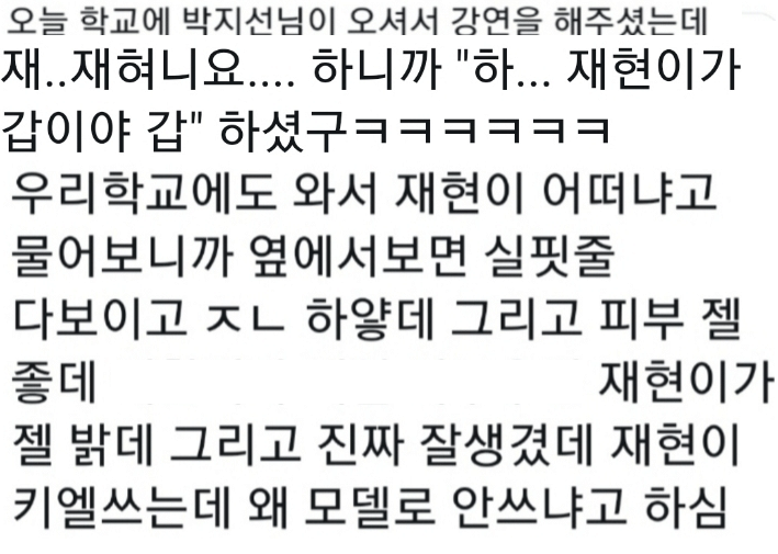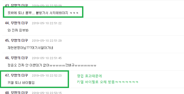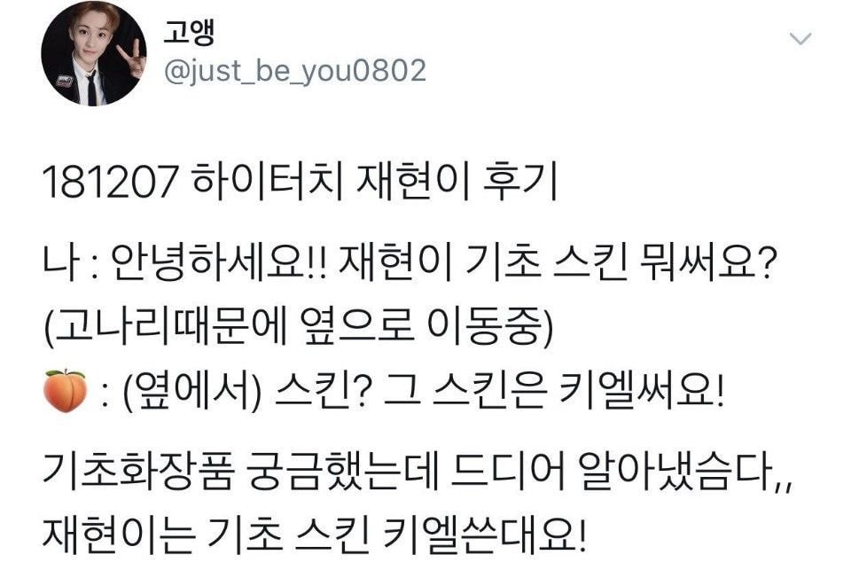재현: 저는 딱 두 개만 바르거든요 원래. 스킨하고 수분크림만 바르는데 크림을 좀 보습이 좋은 걸로 바꿨어요. (피부과?피부샵?에서) 추천받았는데. 그 이게 유해성분이 하나도 없다는.