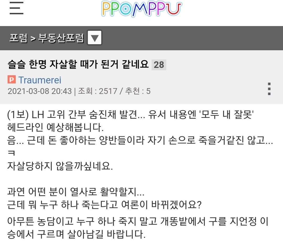 | [1보] LH 현 본부장 경기 분당서 투신 '국민에게 죄송' 유서 (0) | 2021.03.12 |