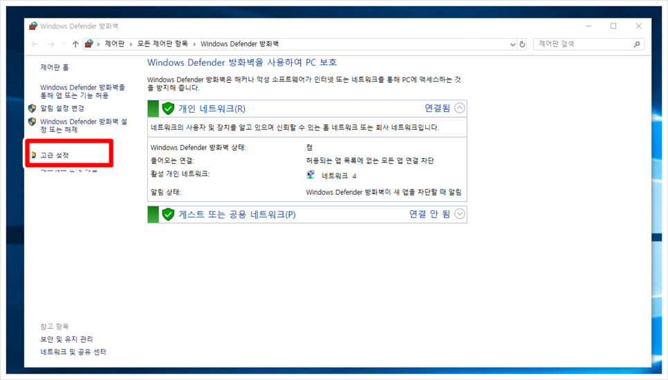 위와 같은 그림에 Windows Defender 방화벽 항목에서 KMP의 광고 제거를 위해서는 네트워크에 위와 같이 초록색으로 표시되어 하는데, 그것 확인 후 좌측 빨간 줄로 표시되어 있는 고급 설정을 클릭합니다.